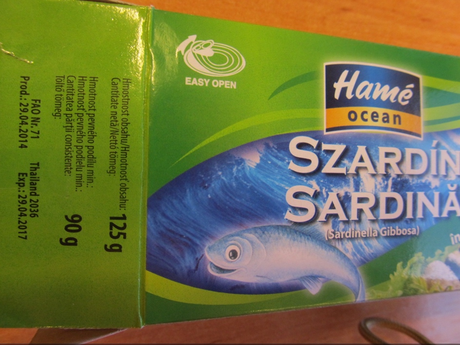 Sardinky ve vlastní šťávě Hame Oceán, šarže LSSNJ 294Q1/TH NO. 2036, DMT (datum minimální trvanlivosti) 29. 4. 2017 (distribuováno 5264 ks/staženo 2368 ks)