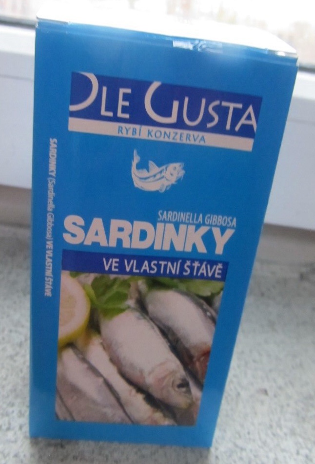 Sardinky ve vlastní šťávě Dle Gusta, šarže LSSNJ 244Q1/TH NO. 2036, DMT (datum minimální trvanlivosti) 24. 4. 2017. (distribuováno 54908 ks/staženo 13758 ks)