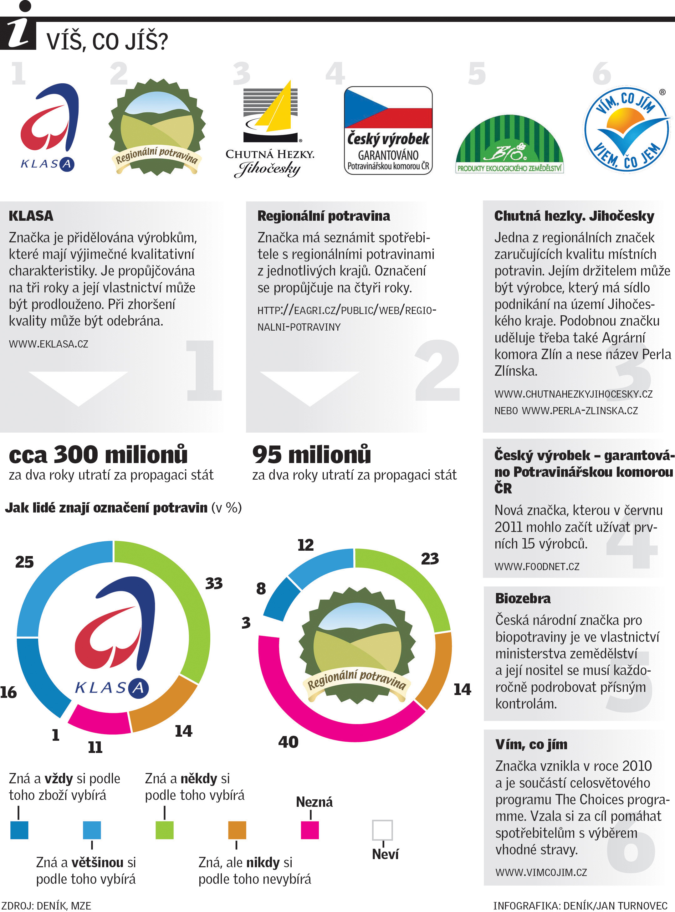 Třeba právě do propagace známky Regionální potravina se chystá ministerstvo zemědělství letos a příští rok investovat celkem 95 milionů korun. Tímto logem se už pyšní 170 výrobků ze 13 českých regionů. Dnes bude například vyhlášena místní specialita v Karlovarském kraji. „Naším cílem je prosadit na trhu potraviny od místních producentů, které mají jasný původ, jsou zárukou dobré kvality a výjimečných chuťových vlastností," vysvětlil finanční podporu šéf resortu Petr Bendl (ODS).