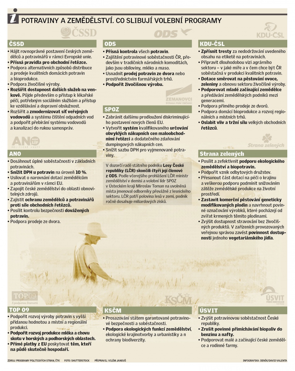 „To, že se v posledních necelých deseti letech zdůrazňuje původ, kvalita a bezpečnost potravin a zdravý lokální patriotismus nabývá na významu, je správně," uvedl zemědělský analytik Petr Havel. Vzápětí se ale zachmuří. „Žádná politická strana nemá ucelenou koncepci českého zemědělství. Jedinou dlouhodobou koncepci má KSČM, ale je postavená na produkci a velkých podnikových celcích, ne na tom, čemu se říká udržitelný rozvoj. Takže tato koncepce je nepoužitelná," zhodnotil v kostce analytik volební programy.