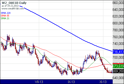 Trh začal od 21. října vytvářet ukázkovou formaci kulatého dna. V současné době se pohybuje blízko supportu vytvořeného dvojitým vrcholem na úrovni 650 centů za bušl.