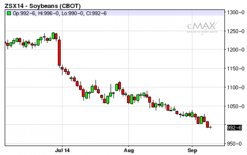 Cena sójových bobů během včerejší obchodní seance poklesla pod deset dolarů za bušl. Od této úrovně se trh v předchozích třech obchodních seancích odrážel. Analytici oslovení společností Bloomberg odhadují, že celková letošní úroda dosáhne 3,894 miliónu bušlů, zatímco analytici oslovení společnosti Reuters odhadují 3,883 miliónu bušlů. Srpnový odhad amerického ministerstva zemědělství byl na 3,816 miliónu bušlů. I tak by se jednalo o dramatický 16 procentní nárůst objemu sklizně. Zítra v 18:00 vyjdou aktualizované odhady amerického ministerstva zemědělství (WASDE).