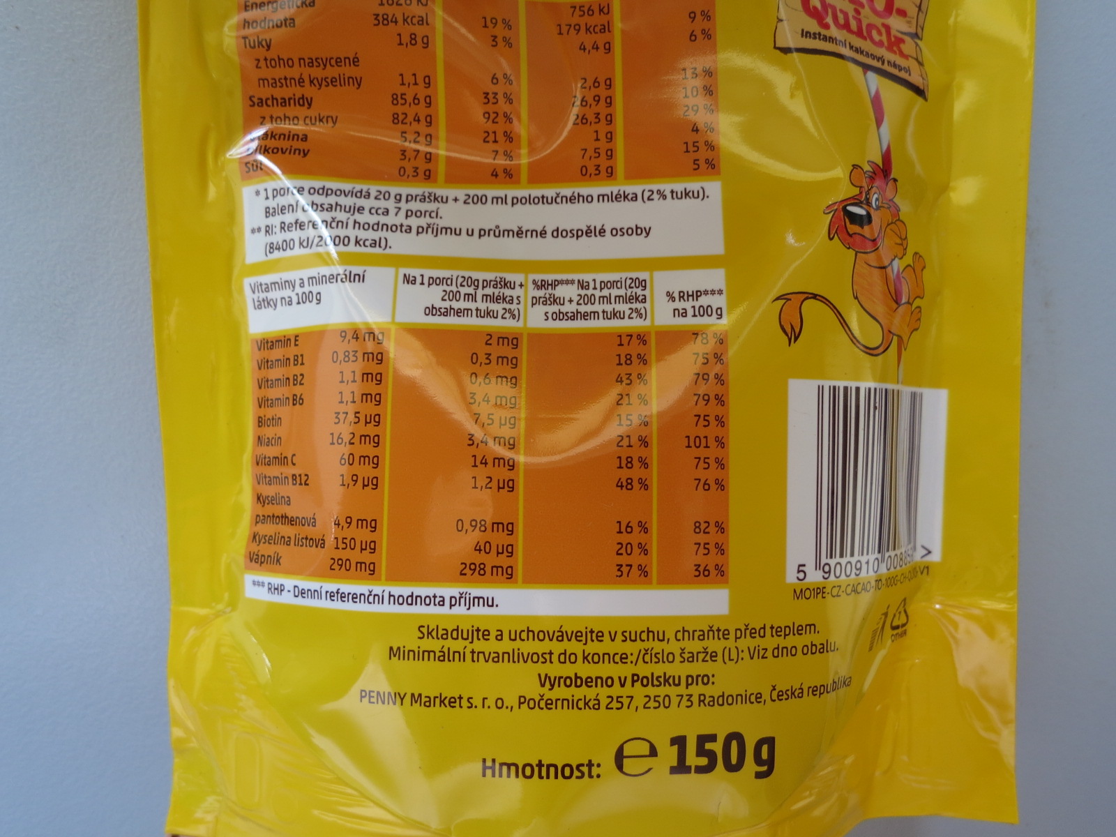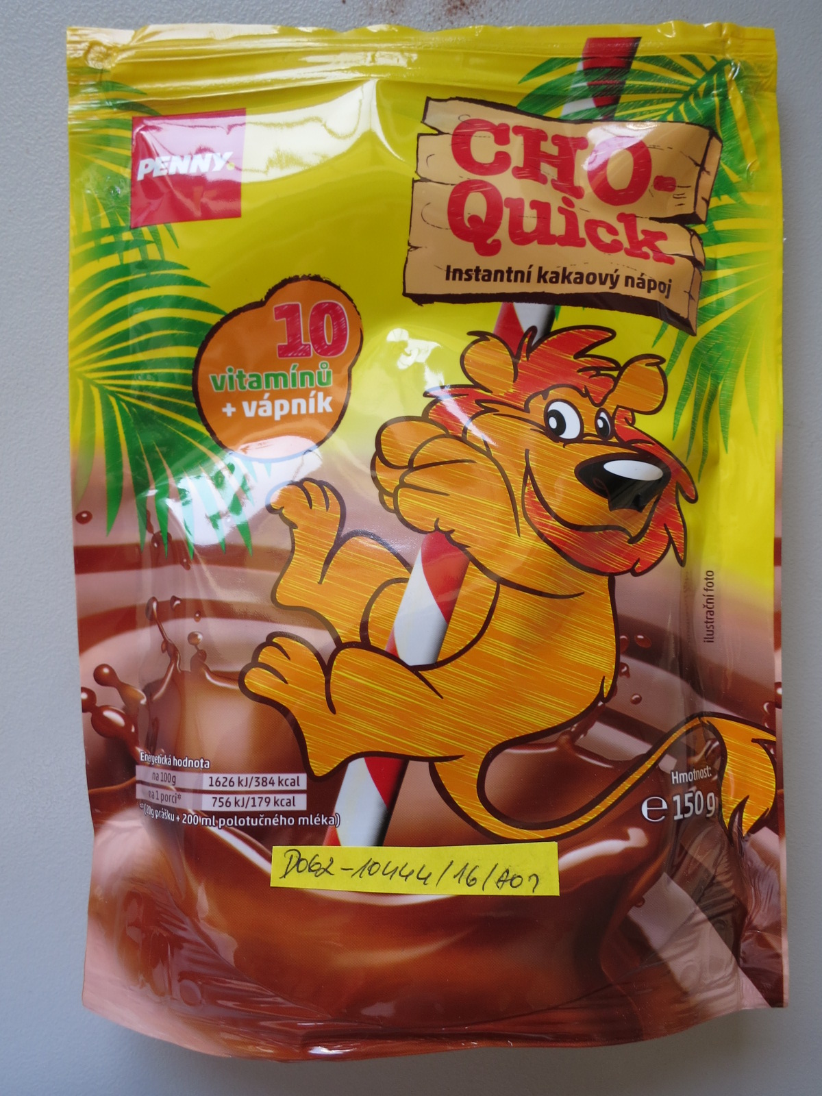 PENNY CHO Quick, Instantní kakaový nápoj 10 vitamínů + vápník, označení šarže: L30756F, datum minimální trvanlivosti do: 09.2017, země původu: Polsko. Výrobce na obalu uvedl, že směs může obsahovat stopy mléka. Za maximální přípustnou hranici pro „stopy mléka“ lze považovat koncentraci 25 miligramů na kilogram (mg/kg). Laboratorní analýza ale prokázala koncentraci téměř stokrát vyšší, 2478 mg/kg. Potravinu inspektoři odebrali v pobočce společnosti Penny Market s.r.o.