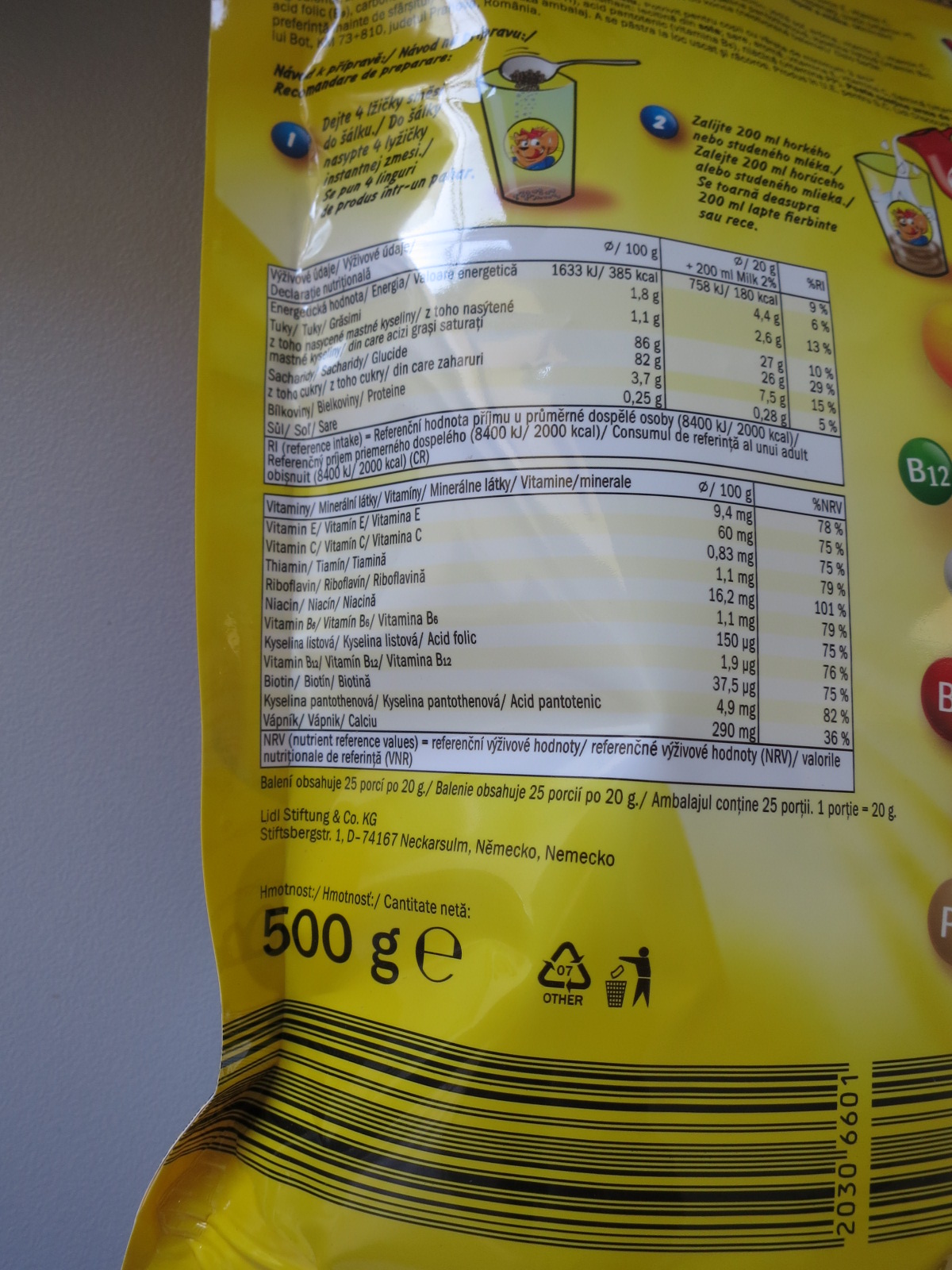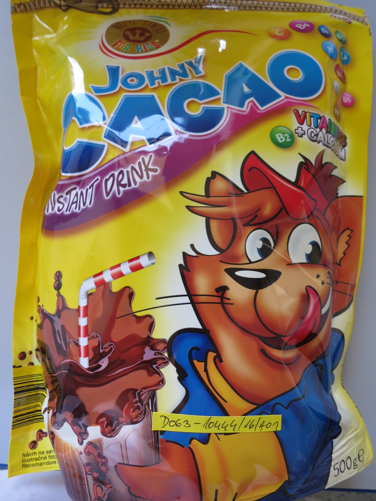 JOHNY CACAO INSTANT DRINK VITAMINS + CALCIUM, označení šarže: L22955C, datum minimální trvanlivosti: 04.2017, země původu neuvedena. Výrobce na obalu uvedl, že směs může obsahovat stopy mléka. Laboratorní analýza prokázala koncentraci mléčné bílkoviny ve směsi v hodnotě 454 mg/kg. Potravinu inspektoři odebrali v pobočce společnosti Lidl Česká republika v.o.s.