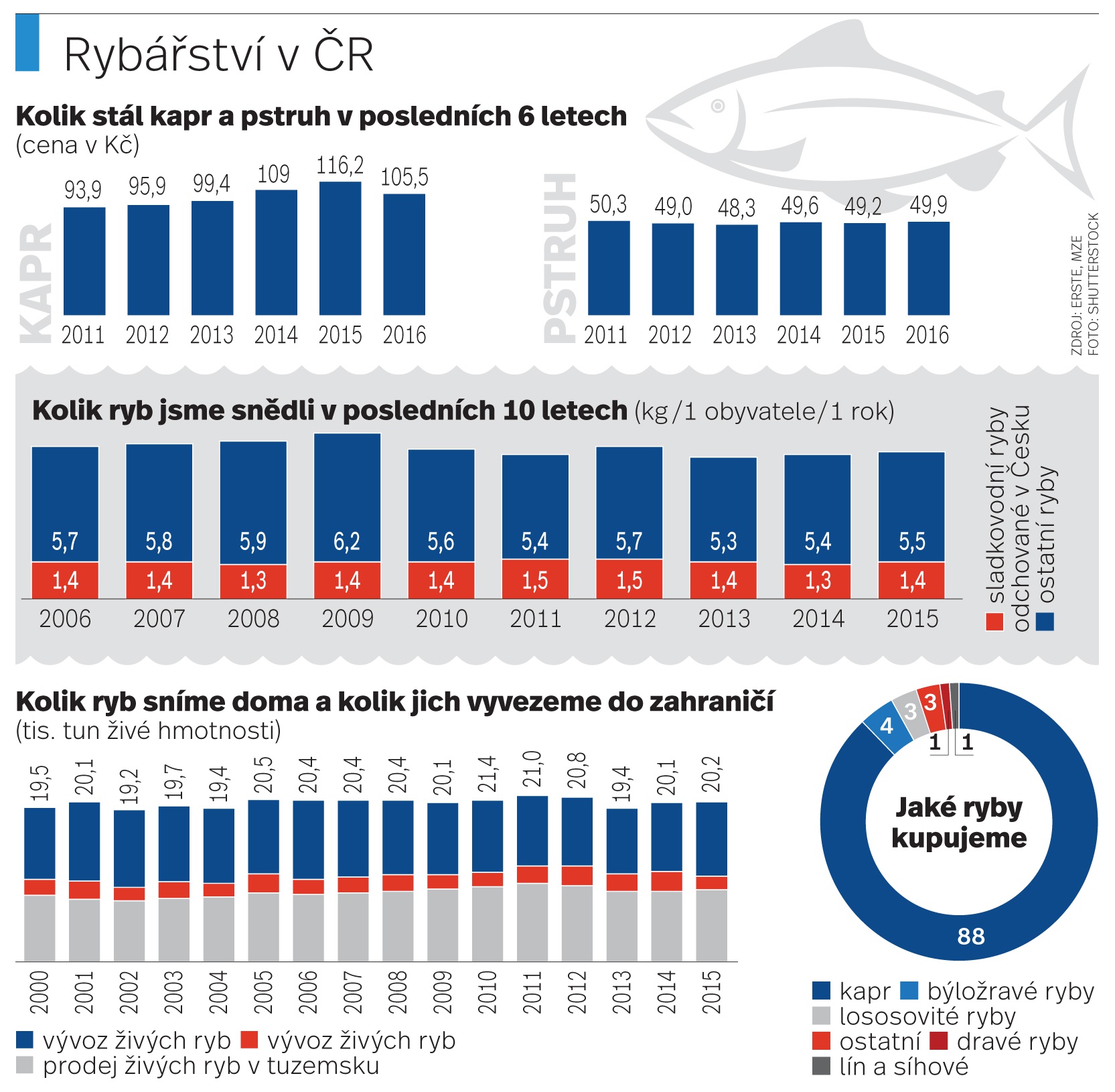 Do zahraničí vyvezeme o něco více ryb, než jich sníme doma. V posledních deseti letech rybáři odchovali a prodali kolem 20 tisíc tun ryb. Na českém trhu skončilo v roce 2015 zhruba devět tisíc tun rybího masa a do ciziny putovalo zhruba deset tisíc tun.