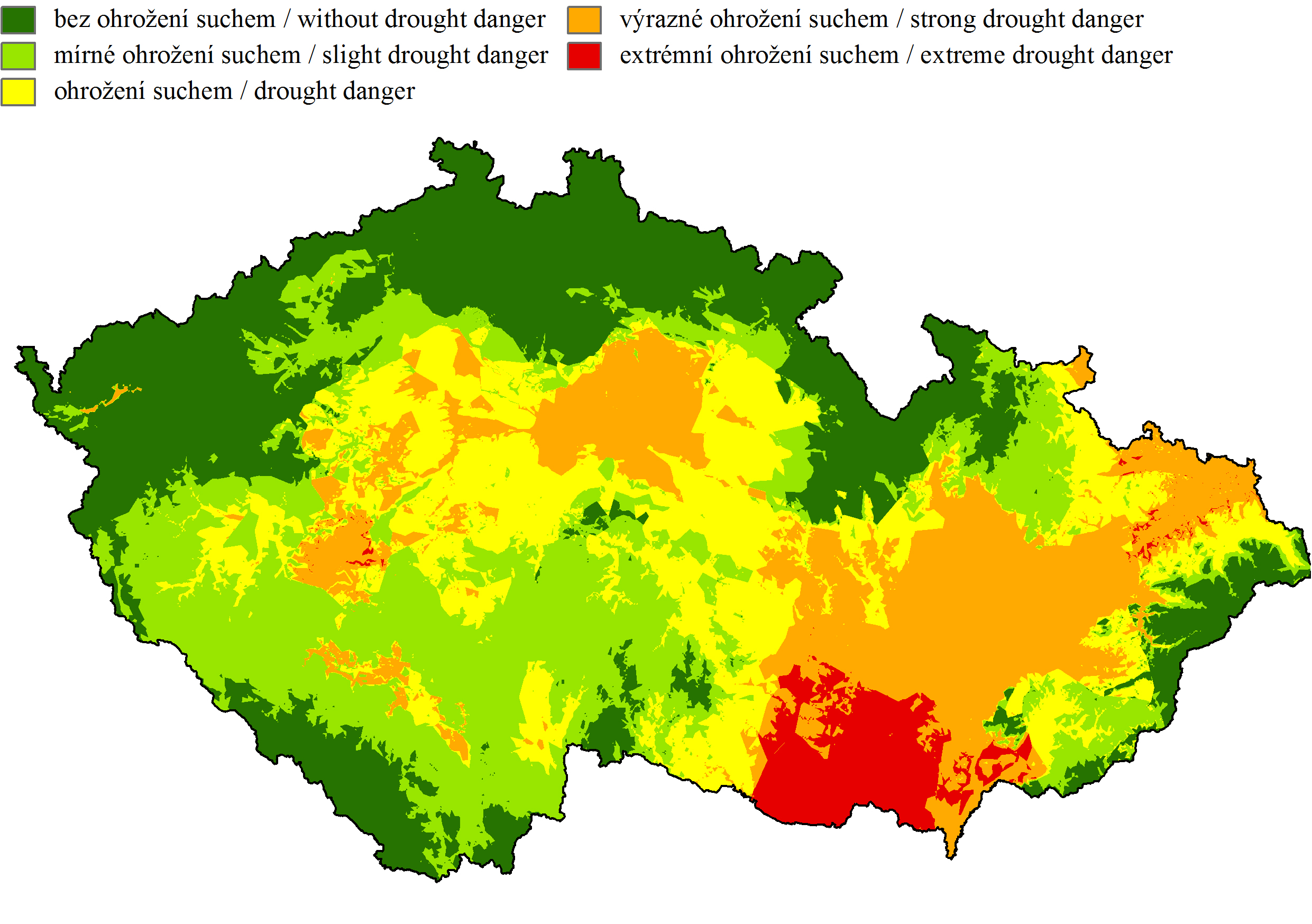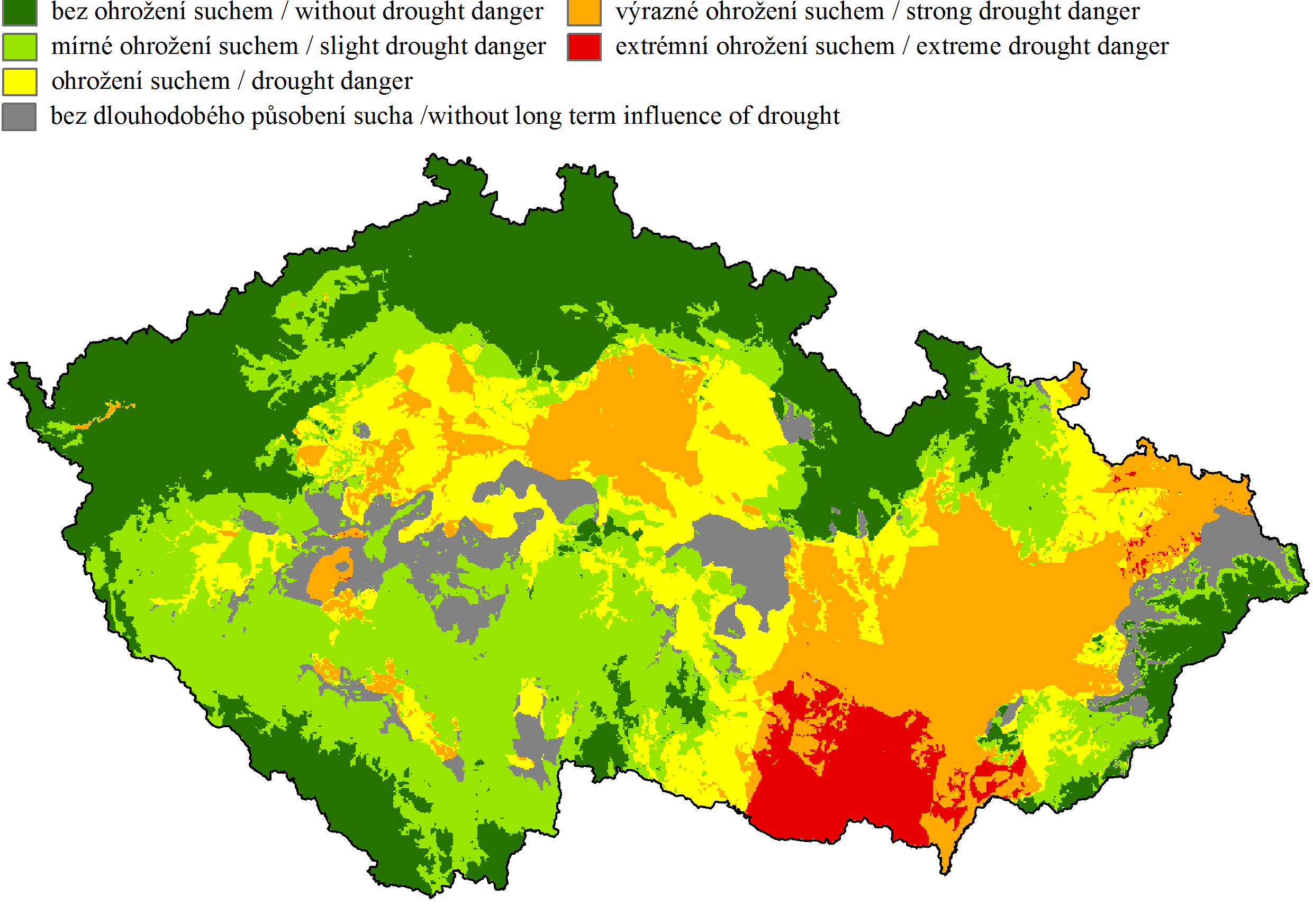 Kombinovaná mapa ohrožení smrkových porostů suchem: Výsledná mapa definuje oblasti, ve kterých došlo ke kombinaci dlouhodobého stresu lesních porostů suchem v předchozích třech vegetačních obdobích a akutního stresu suchem v roce 2015. Řešitelé vychází z předpokladu, že k akutnímu kalamitnímu poškození může dojít pouze v případě víceletého chronického působení sucha. Pro vznik kalamitního poškození smrkových porostů suchem jsou uvažovány tři kategorie: ohrožení suchem, výrazné ohrožení suchem a extrémní ohrožení suchem.