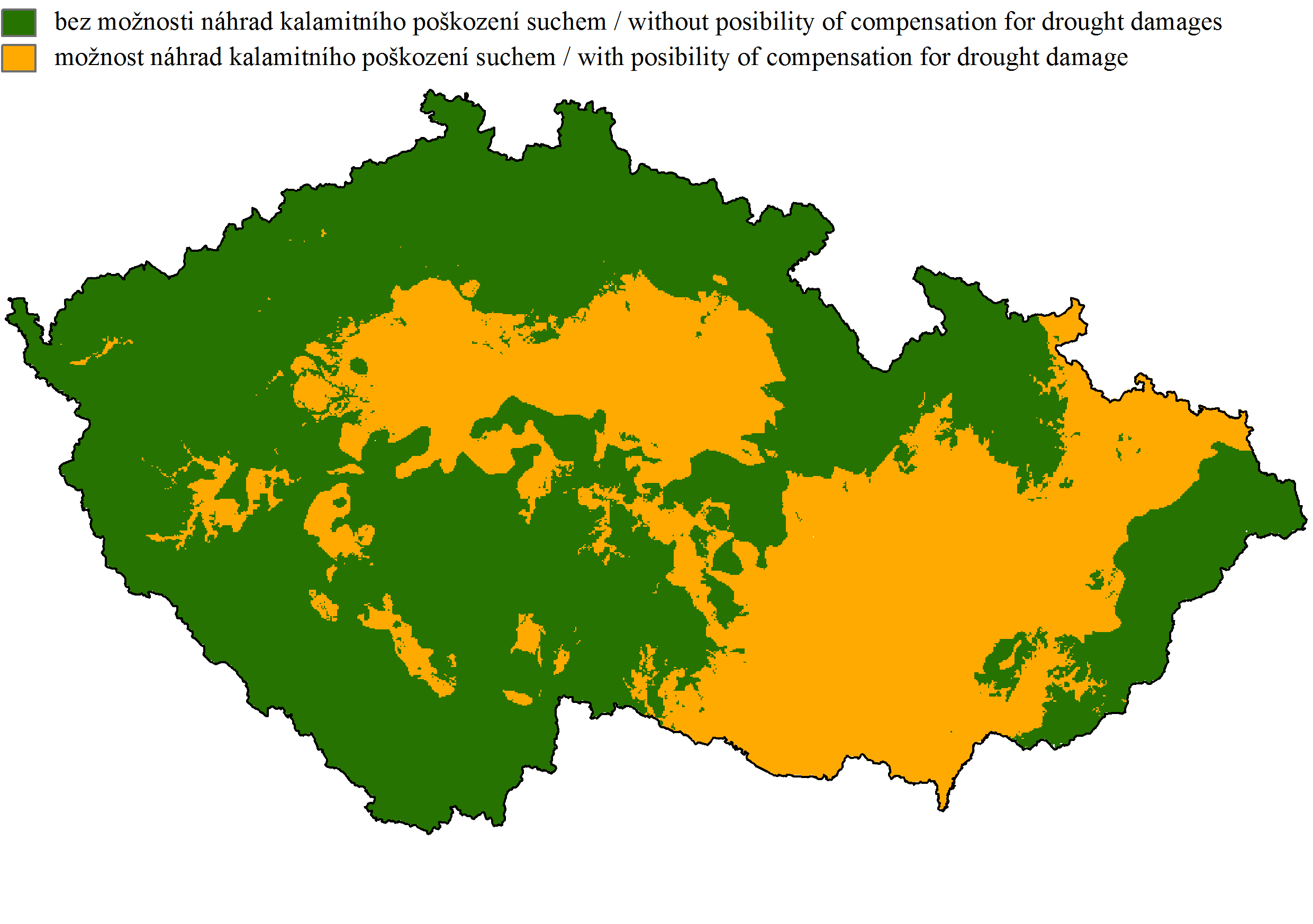 Pro účely poskytování náhrad kalamitního poškození suchem byly oblasti sloučeny do dvou kategorií: 1) bez možnosti náhrad = bez ohrožení suchem + mírné poškození suchem + oblast bez dlouhodobého působení sucha; 2) s možností náhrad kalamitního poškození suchem = oblasti ohrožené až extrémně ohrožené suchem v roce 2015 a zároveň s nepříznivou vláhovou bilancí v letech 2012–2014