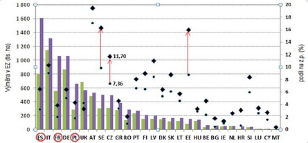 Největší absolutní nárůst ploch v EZ od roku 2007 zaznamenalo jednoznačně Španělsko, Francie a Polsko. Naopak mezi země s největším podílem EZ na zemědělské půdě (nad 10 %) se řadí postupně: Rakousko, Švédsko, Estonsko, ČR a Lotyšsko. Největší nárůst podílu EZ od roku 2007 zaznamenalo Estonsko, Švédsko a Česká republika. ČR si tak v rámci EU udržela 9. místo ve výměře a 4. místo v podílu EZ na zemědělské půdě (viz Graf 6).